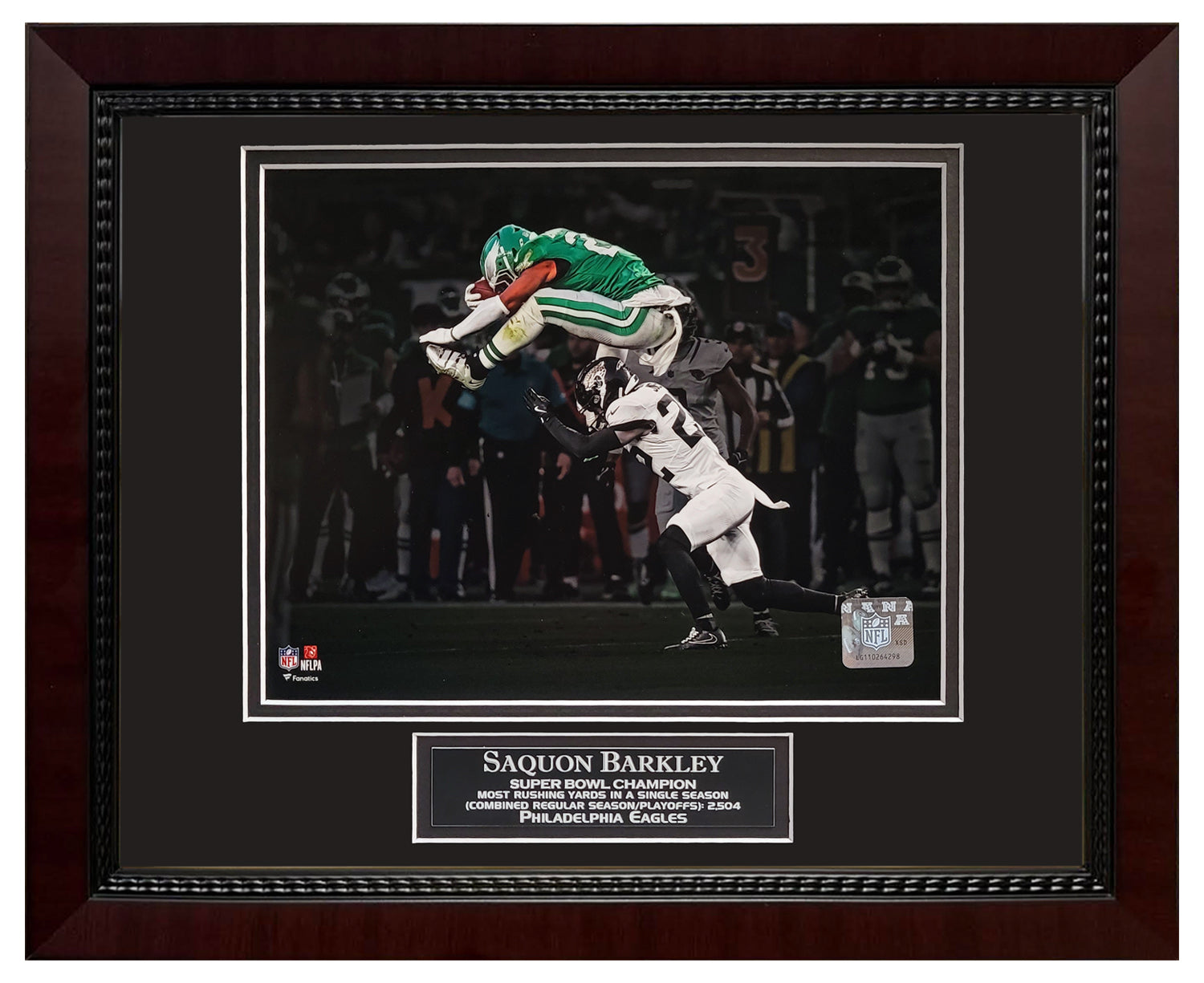 Saquon Barkley backwards leap photograph, framed to 13x16, comes professionally double-matted with a laser-engraved nameplate. This Philadelphia Eagles collectible comes ready for display in any home or office. The piece highlights one of the most electrifying plays of the 2024 NFL season.