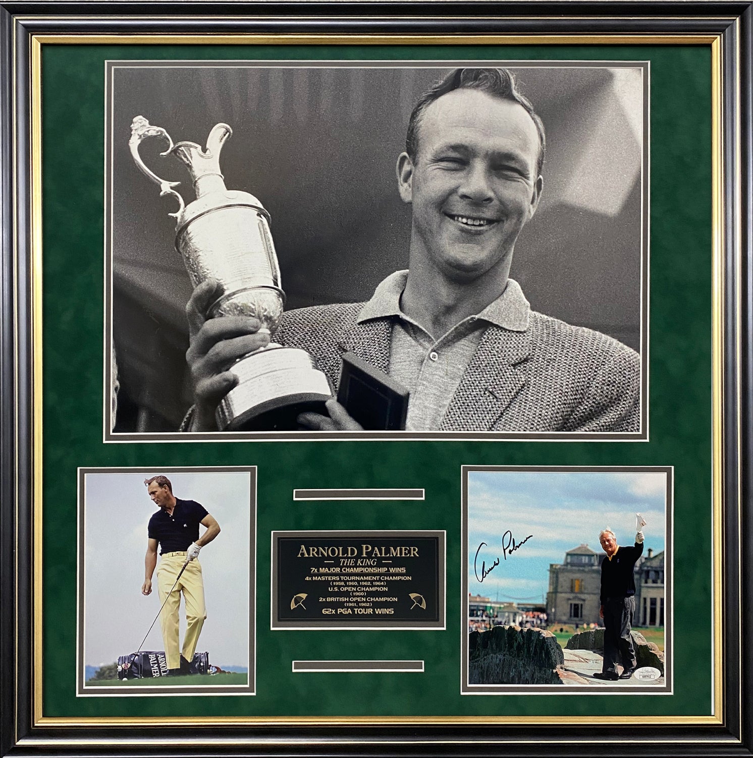 Arnold Palmer autograph photo 3 way collage, matted to 25x25, golf.