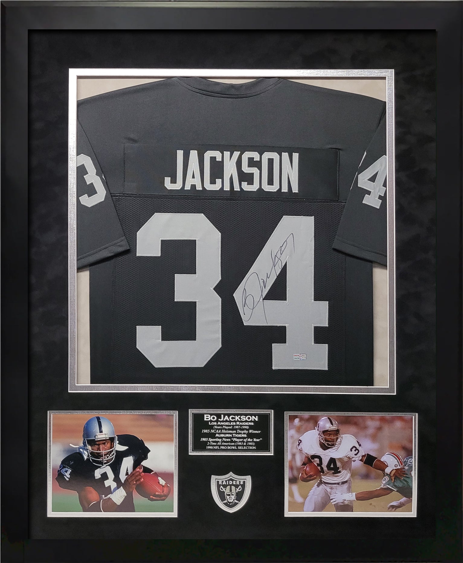 The Bo Jackson autograph Los Angeles Raiders jersey, framed to 37x45, comes professionally pinned and double matted with a laser engraved nameplate, 2 photos, and team logo patch. This Raiders collectible includes Tri-Star Authentication and is ready for display in any fan's home, office, or business. A strong collectors piece for any fan.