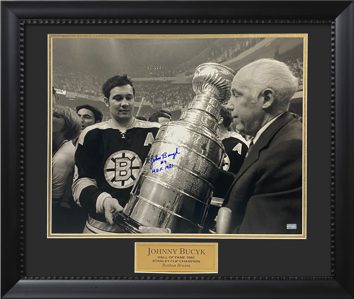 Johnny Bucyk Autograph Photo Hold Cup 23x27. Boston Bruins Stanley Cup Champion.