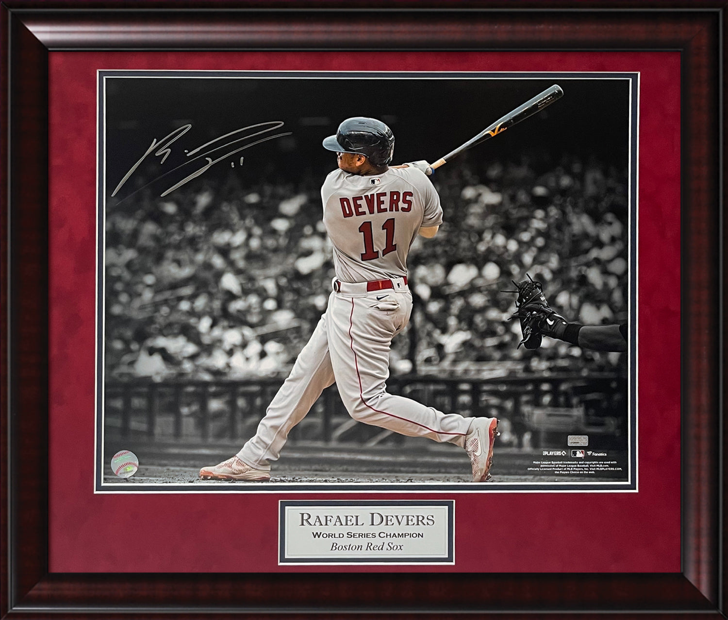 Rafael Devers Autograph Photo Swing Spotlight, matted and framed to 23x27. Boston Red Sox.
