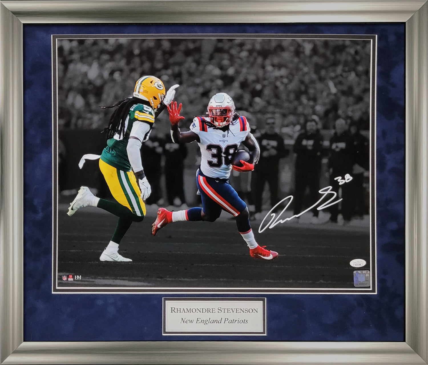 Rhamondre Stevenson Autograph Photo Vs Packers, matted and framed to 23x27. New England Patriots.