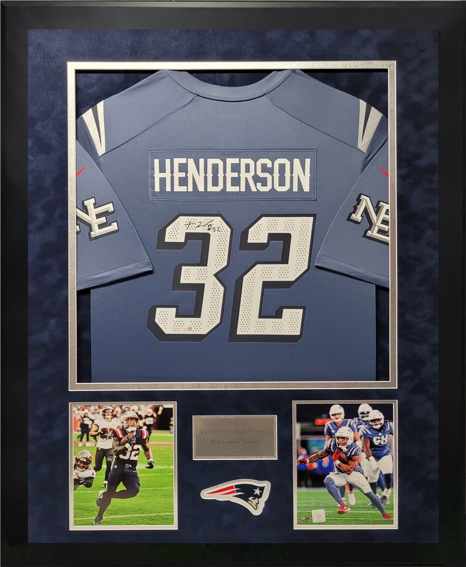 The TreVeyon Henderson autograph New England Patriots Rivalry jersey, framed to 37x45, comes professionally pinned and double matted with a laser engraved nameplate, 2 photos, and team logo patch. This Patriots collectible includes James Spence Authentication and is ready for display in any fan's home, office, or business. A strong collectors piece for all fans of the team.